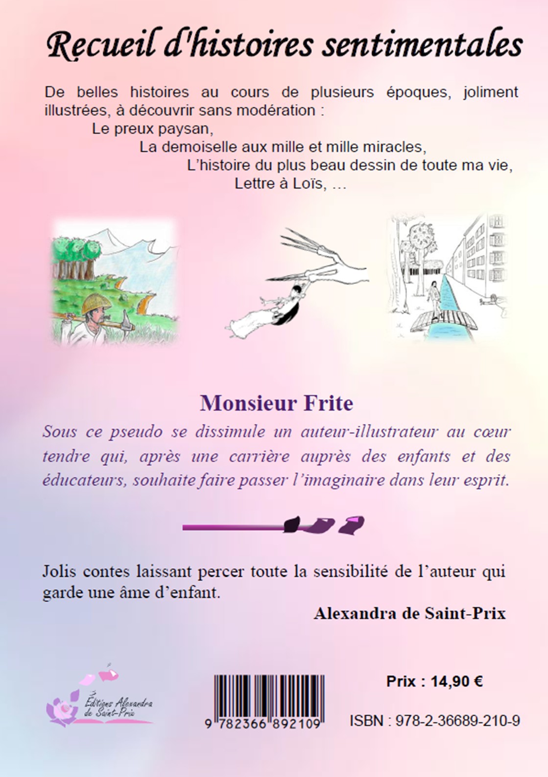 La période printanière est propice à se replonger dans certaines lectures et c’est le cas avec « Recueils d’Histoires sentimentales » (Editions Alexandra de Saint-Prix) de Monsieur Frite. Pour son premier ouvrage, l’auteur occitan a pris le pari de proposer un format de textes courts mêlant sensibilité et humour le tout illustré par certaines de ses créations. Si le premier texte peut nous orienter vers une thématique plutôt jeunesse, les autres sont plus guidés par une forme de mélancolie appuyée par la plume sentimentale de l’auteur, certainement nourrie par son propre vécu pour agrémenter certains passages. Comment ne pas s’identifier au cours de certains passages tant les écrits peuvent nous rappeler à notre propre existence sociétale ? Le rythme soutenu nous laisse voyager sans relâche dans l’univers très large de Monsieur Frite. « Recueil d’histoires sentimentales » est donc à avoir dans sa bibliothèque, comme la première pierre d’un édifice de l’écrivain héraultais. Ce livre est la promesse de d’autres ouvrages, c’est certain.